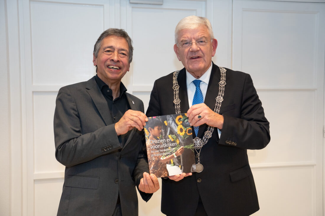 Ter gelegenheid van het 80-jarig jubileum van het einde van de Tweede Wereldoorlog in het Koninkrijk der Nederlanden heeft Paul Doop vandaag het jubileumboek Omzien en vooruitkijken. 80 jaar 15 augustus 1945 aangeboden aan burgemeester Jan van Zanen van Den Haag.